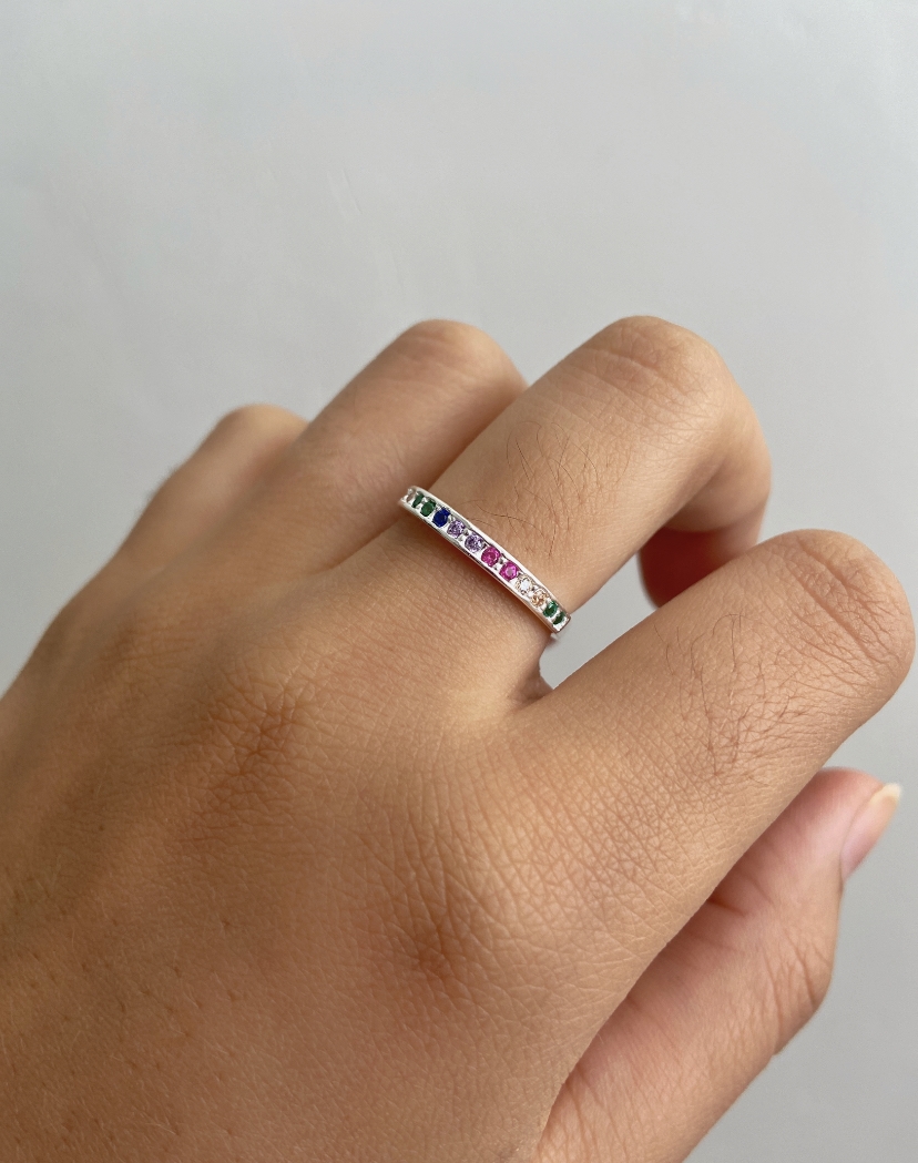 Anel Zircônias Baguetes Coloridas e Pontos de Luz