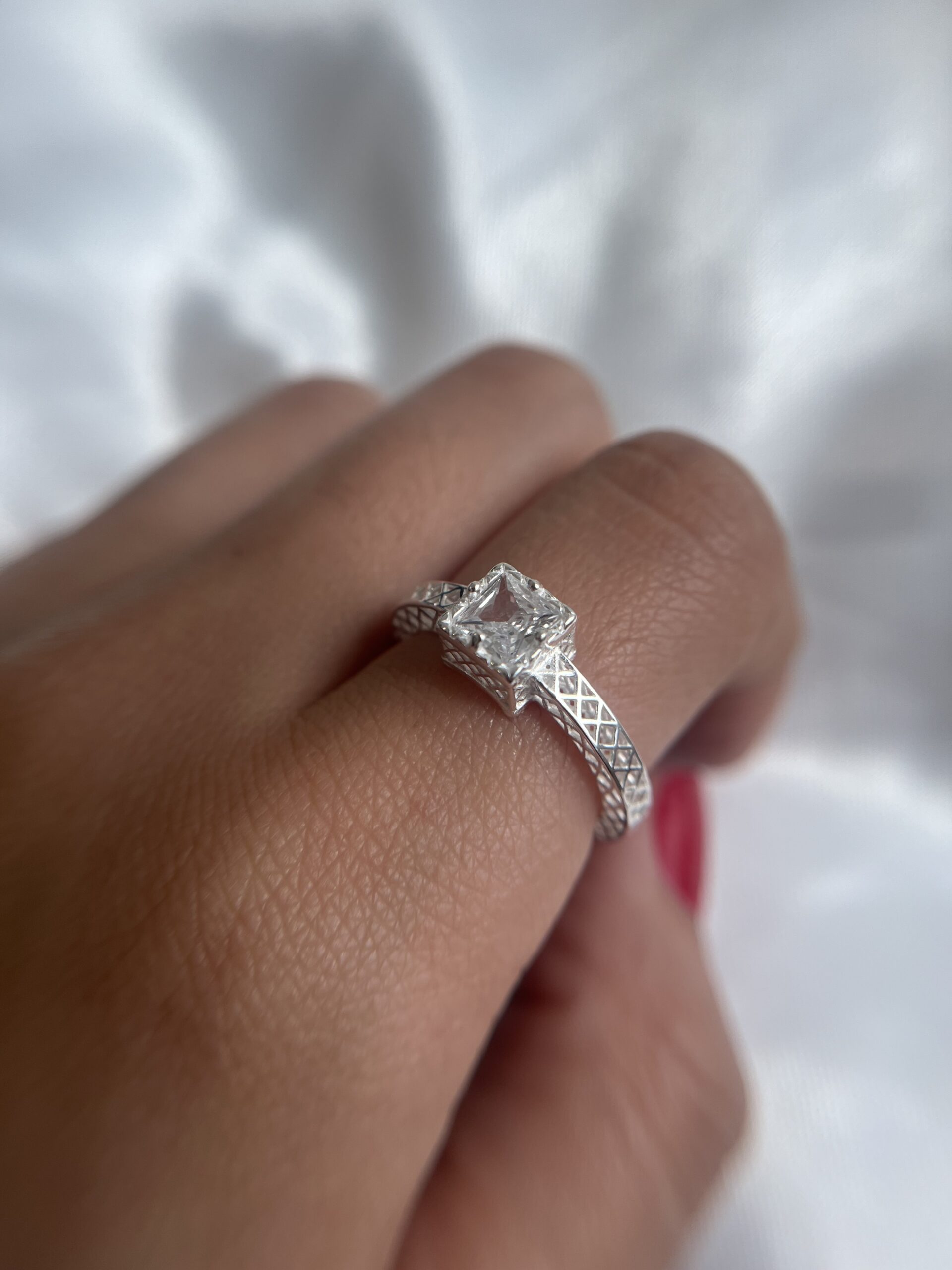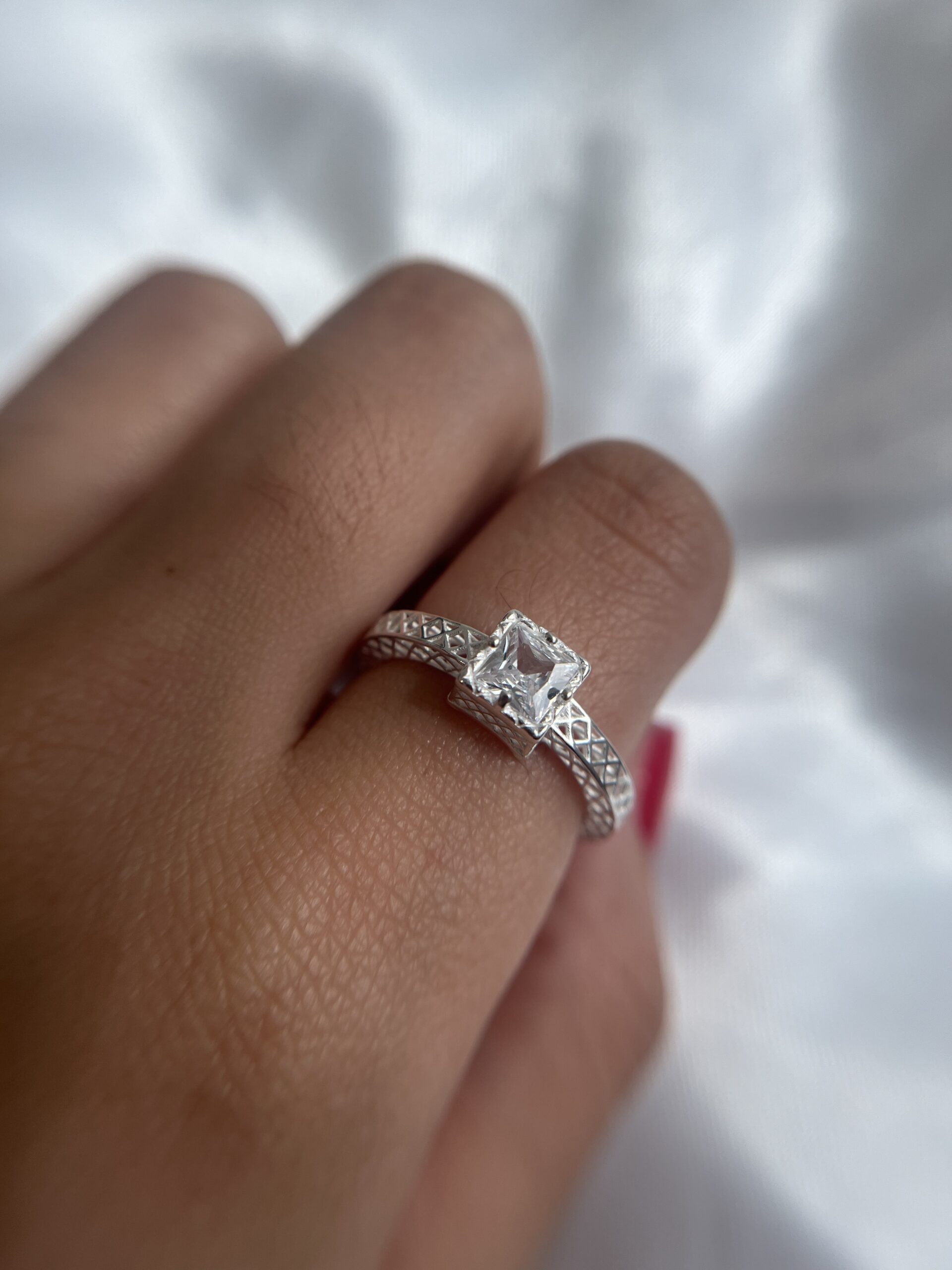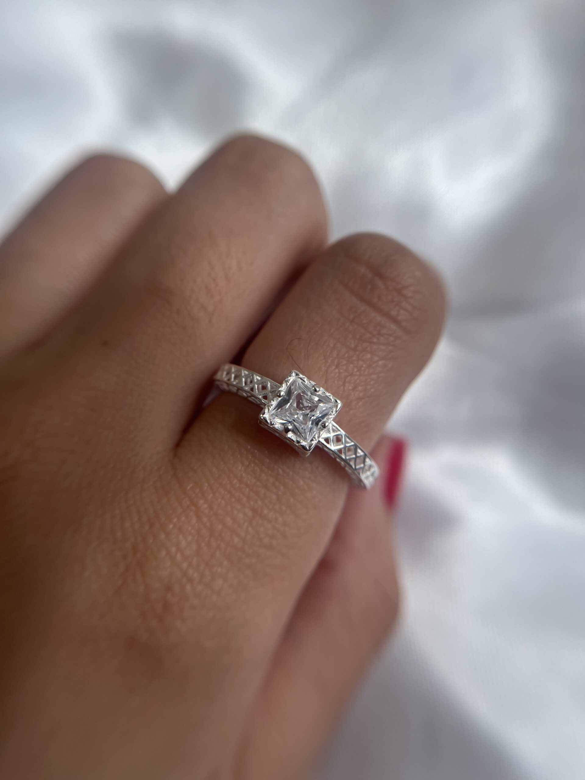 Anel Solitário Trabalhado Zircônia Quadrada 6mm