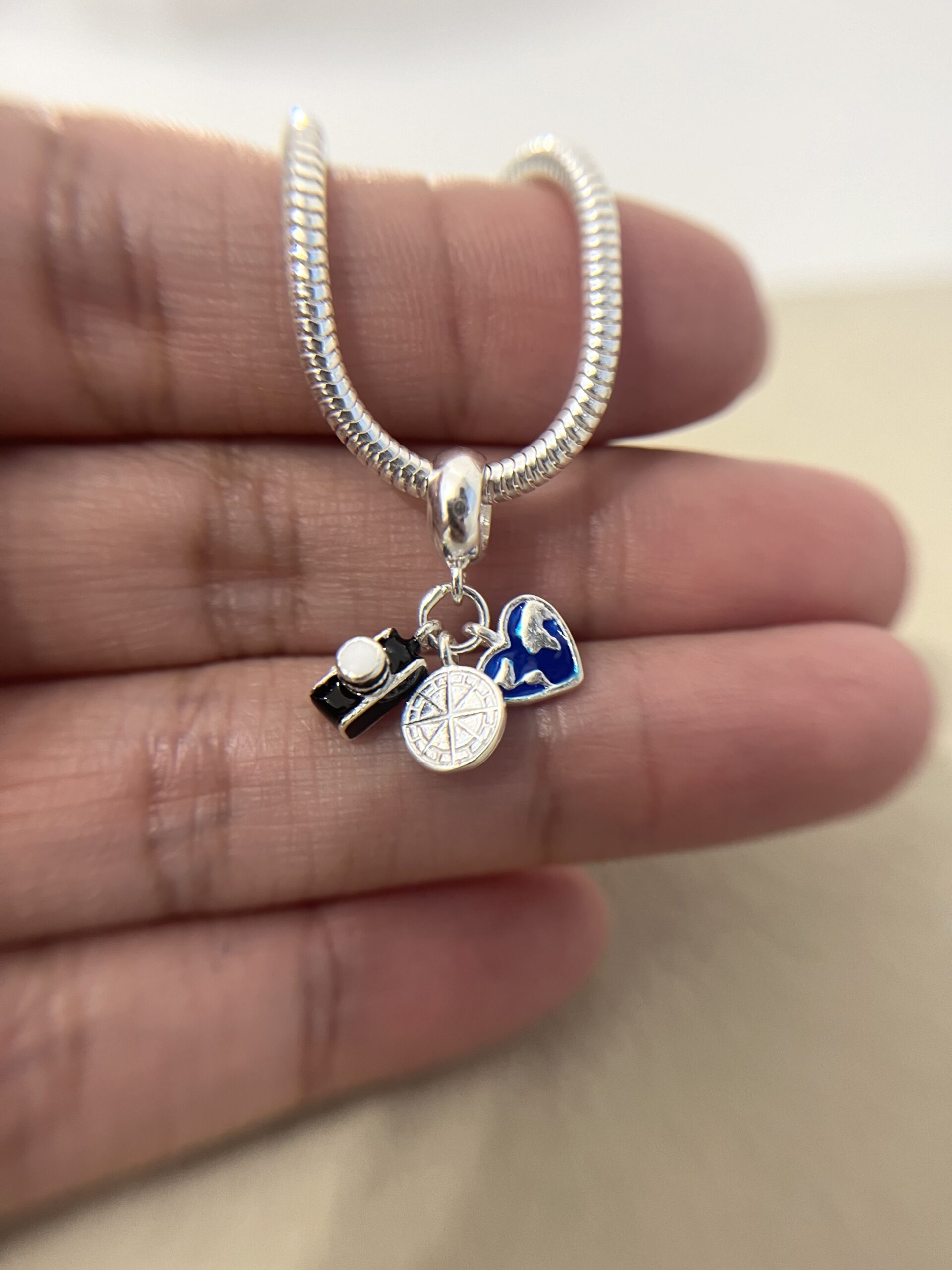 Berloque Câmera, Bússola e Mapa Mundi Resinado