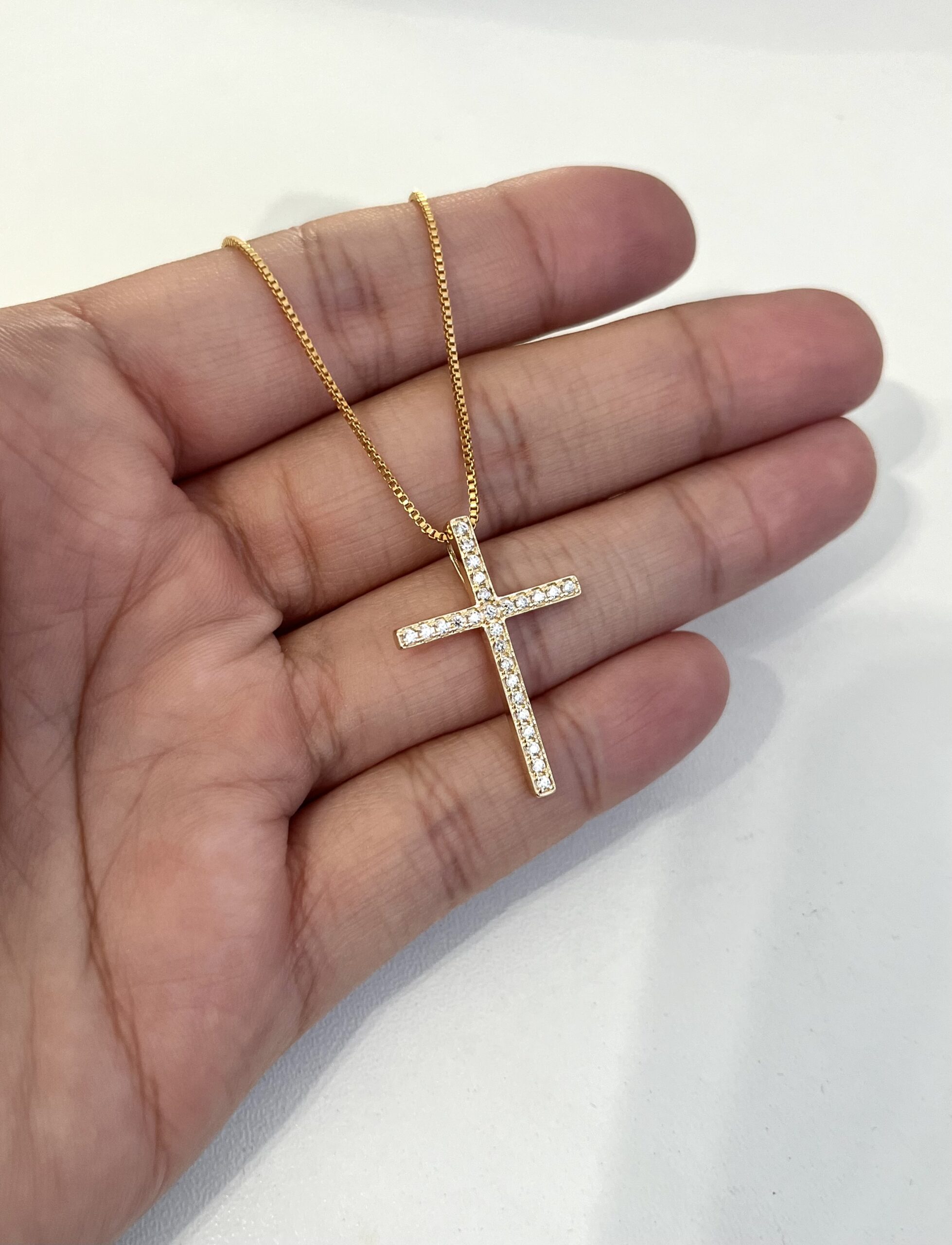 Símbolo de fé, proteção e esperança, o colar de cruz cravejada une espiritualidade e sofisticação em uma única peça. Banhado a ouro 18k, possui acabamento refinado e zircônias cravejadas que proporcionam um brilho delicado e elegante.